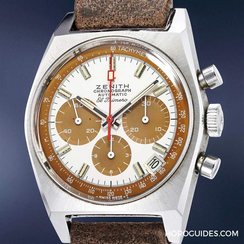 ZENITH的El Primero在表界自然有其重要地位,而這款El Primero SP 1301是El Primero系列早期的版本,計時表盤以及面盤外緣的測速環都已經氧化,Tropical熱帶面呈現美麗的棕色,甚至是接近更淺的核果色,色調均勻,表徑37mm,