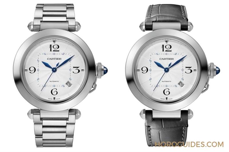 Pasha de Cartier腕表于7月1日在中國(guó)上市,9月4日全球發(fā)行。共推出35mm和41mm兩種尺寸,表冠鑲嵌一顆凸圓形藍(lán)色合成尖晶石。搭配皮表帶或精鋼表鏈,配置「QuickSwitch」互換式系統(tǒng),鏈節(jié)采用SmartLink可調(diào)校式系統(tǒng),可自行調(diào)整長(zhǎng)度。同步推出精鋼、K金、「舞動(dòng)」鑲嵌鉆石和鏤空機(jī)芯等豐富款式。