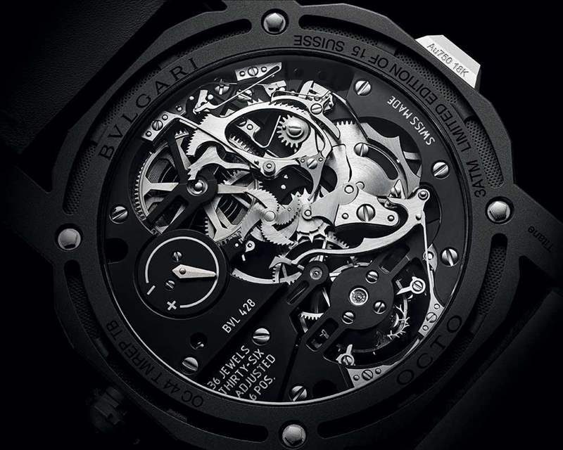 全新BVL428機芯由陀飛輪調節,為三錘報時裝置注入活力。第一個音符C為小時,第二個為四分之一的一系列中間重C音符,而最后一個音符為分鐘響出中間音符。順便說一句,這款手動上鏈鏤空機芯配備了兩個發條盒,一個確保時間顯示平穩運行,并提供75小時的動力儲存,而另一個則專用于聲音機制。一旦音符被敲定,它就會自動上弦。嵌入表殼中間的按鈕可根據要求激活三問報時器。藍寶石水晶玻璃表背為各組件和動力儲存指示器提供了令人嘆為觀止的視野。