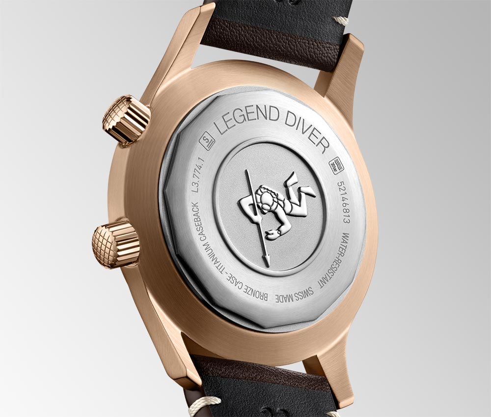 直徑42毫米的Legend Diver腕表表殼配備旋入式鈦金屬表背,避免任何皮膚過敏風險。這張銀色圓盤的雕刻描繪了潛水員的輪廓,就像檔案中的作品一樣。這款金屬表殼搭載L888.5機芯,這是一款自動機芯,可驅動時間功能,并提供約64小時的動力儲存。