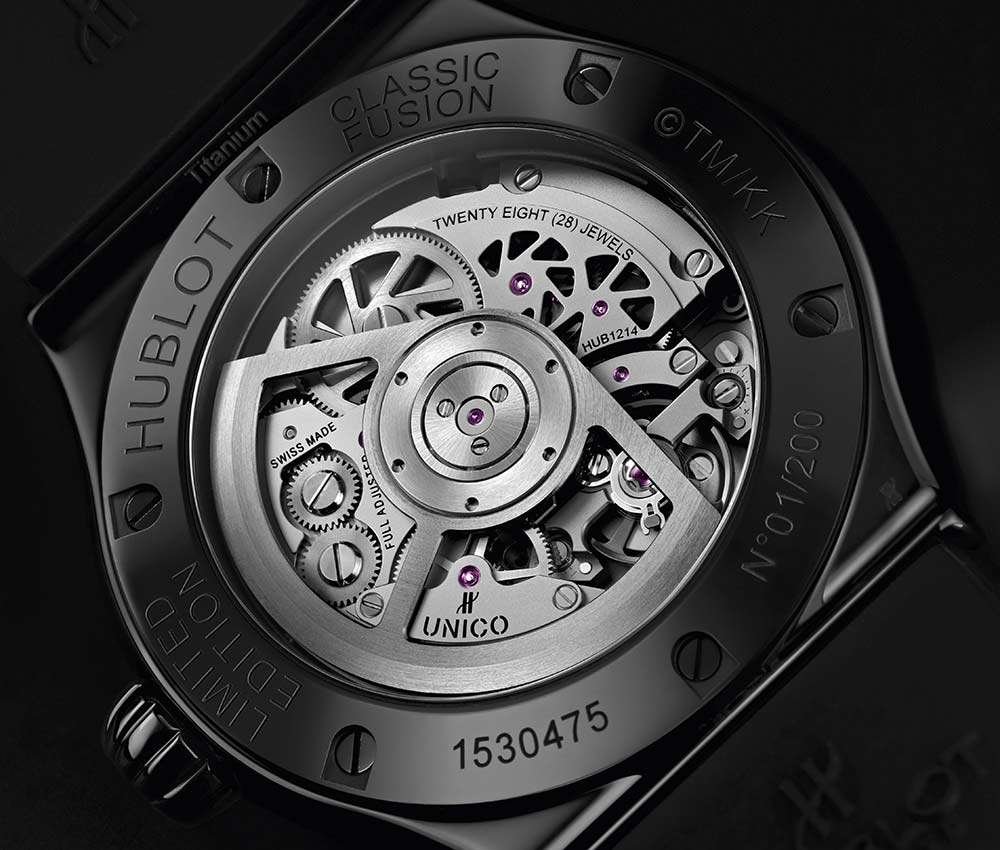 這款全單色限量計200枚,采用宇舶表2006年構想的全黑概念,其直徑45毫米、厚度13.40毫米的表殼完全采用黑色陶瓷制成。該表殼搭載Unico MHUB1214自制機芯,該機芯通常用于Big Bang手表,這是一款自動機芯,可驅動時間數據并提供72小時的動力儲存。