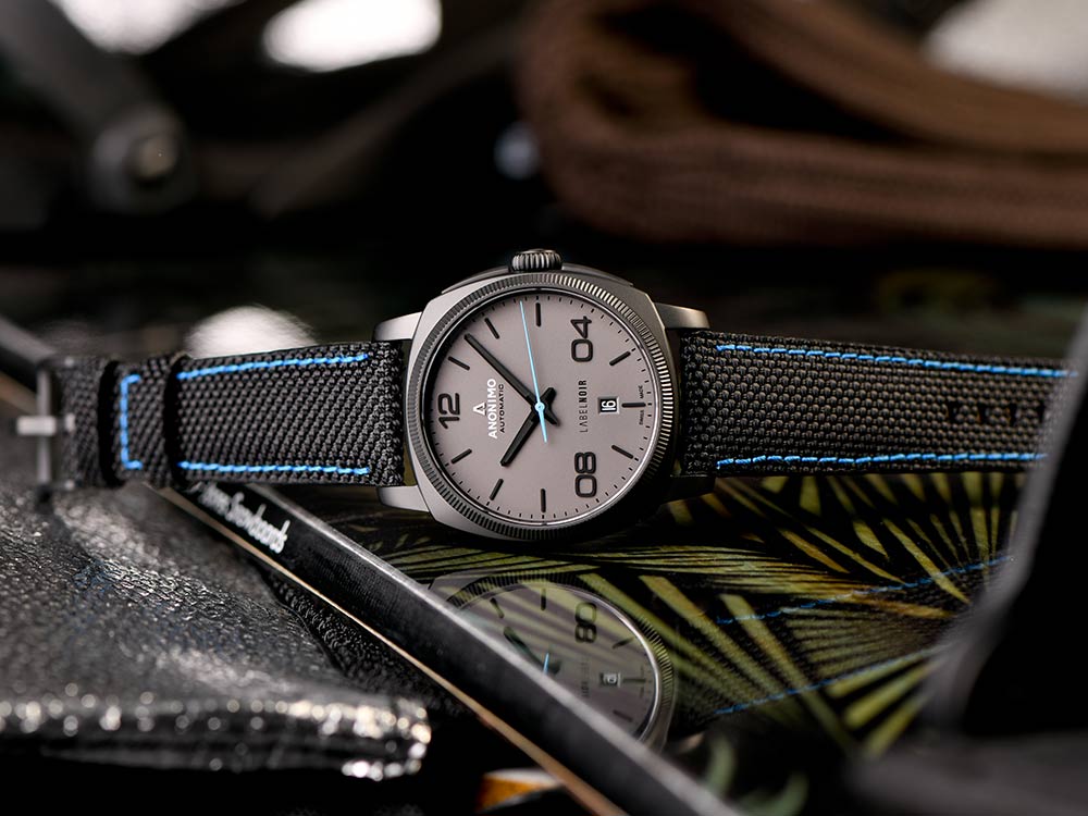 啞光灰色表盤周圍環繞著一個小時的章節,黑色時標和阿拉伯數字由兩個黑色時針和分針懸停。這種刻意變暗的裝飾圍繞著設置在6點鐘位置的日期,邀請秒針占據中央舞臺,并以蔚藍的色調吸引眼球,為直接駕駛者涂上外衣。