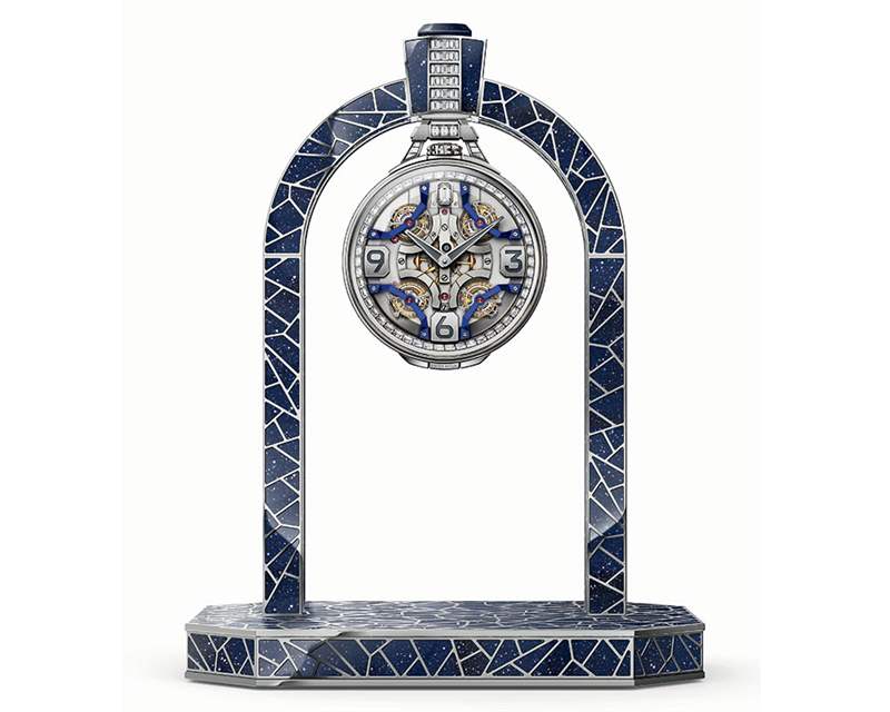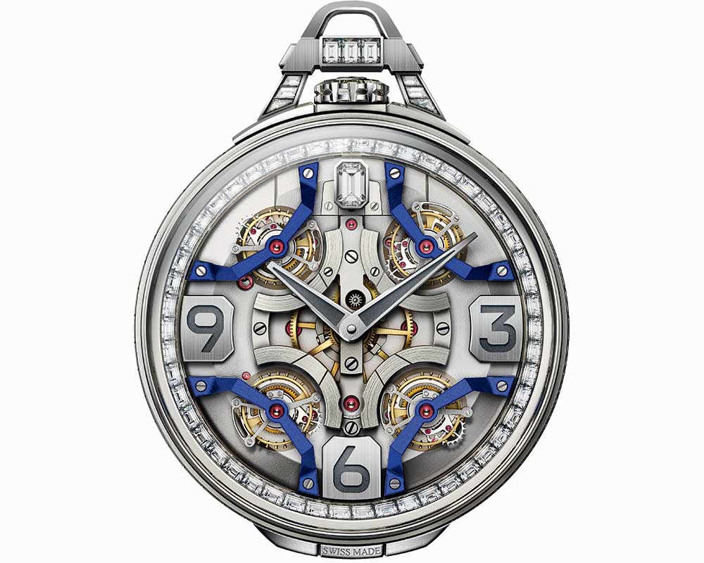 而且,這枚時(shí)計(jì),就像一件高級(jí)珠寶一樣工作,現(xiàn)在像一千顆星星一樣耀眼。表緣和直徑57.2毫米的白金表殼的邊緣鑲嵌著254顆長(zhǎng)階梯形切割鉆石!這些寶石的閃耀凸顯了鏤空表盤及其迷人的場(chǎng)景。在明亮的藍(lán)色鈦金屬橋板下,四個(gè)陀飛輪像旋轉(zhuǎn)的苦行僧一樣旋轉(zhuǎn)。阿拉伯?dāng)?shù)字3、6和9以其較淺的天藍(lán)色調(diào)和凸起的位置脫穎而出。部分橋板和圓盤的飾面營(yíng)造出微妙的浮雕設(shè)計(jì)。而且,這個(gè)活生生的展覽的亮點(diǎn)是一顆祖母綠式切工鉆石,在12點(diǎn)鐘位置的這個(gè)令人驚嘆的場(chǎng)景中占據(jù)著至高無(wú)上的地位。