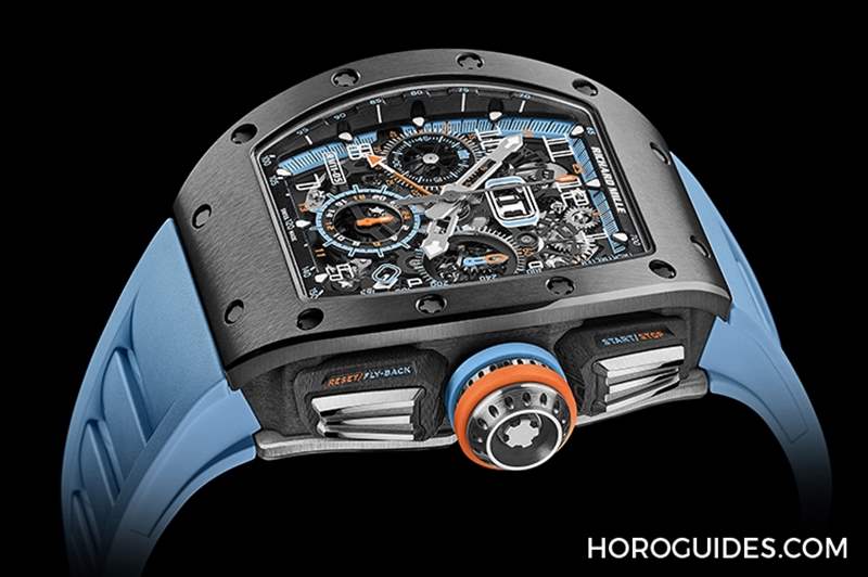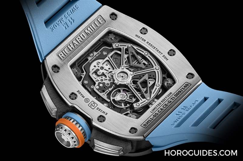外型方面,RM顯目的酒桶形表殼是一大特色自然不在話下,鏤空面盤(pán)點(diǎn)綴的淺藍(lán)色與亮橙色細(xì)節(jié)也是亮點(diǎn),包括面盤(pán)外緣的測(cè)速儀刻度、子盤(pán)面與日期窗的外框、表冠以及橡膠表帶,讓表款因?yàn)檫@些配色更具夏日氣息。附帶一提,這種橘藍(lán)配色剛好是美國(guó)海灣石油公司(Gulf Oil)在60年代贊助賽車(chē)運(yùn)動(dòng)時(shí)的經(jīng)典涂裝,雖然表款并未有相關(guān)的聯(lián)名,但也因?yàn)檫@樣的色彩,賦予表款更多一層的競(jìng)速氣息。RM 11-05飛返計(jì)時(shí)GMT自動(dòng)上鏈腕表,表徑50×42.70mm,限量140只。