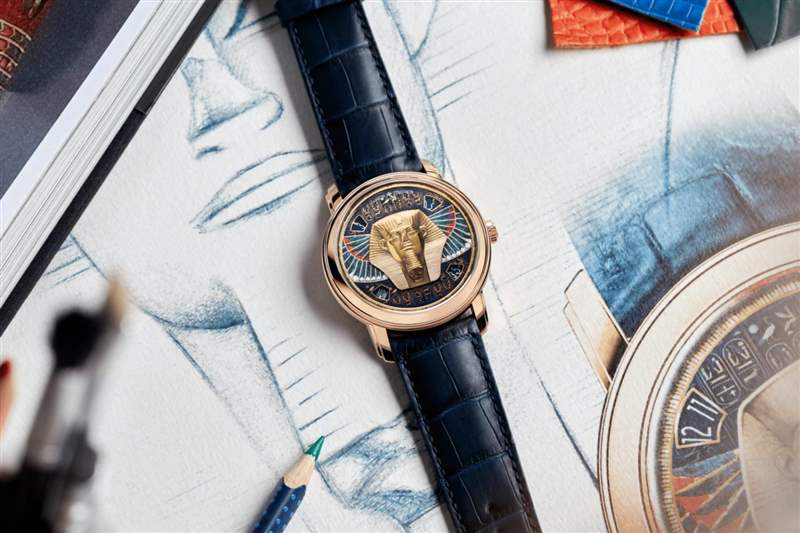 該盤面由 Champlevé 琺瑯制成,裝飾靈感來自 Nakht khonsou irou 的棺材、印記和來世守護的圖標。獅身人面像的應用小雕像和琺瑯表盤都非常漂亮,在 40 毫米直徑的表盤內實現這些細節所需的精度是不可想象的。