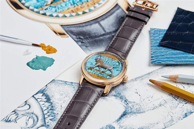 大流士是有史以來最偉大的統治者之一,征服了從現代巴基斯坦到黑海的地區。然而,他的名字在西方可能并不像他向地中海的擴張那樣被希臘人在馬拉松比賽中阻止。為了紀念他的腕表,江詩丹頓在其首都蘇薩(現代伊朗)的大流士宮復制了一種鑲嵌形式的楣紋獅子。