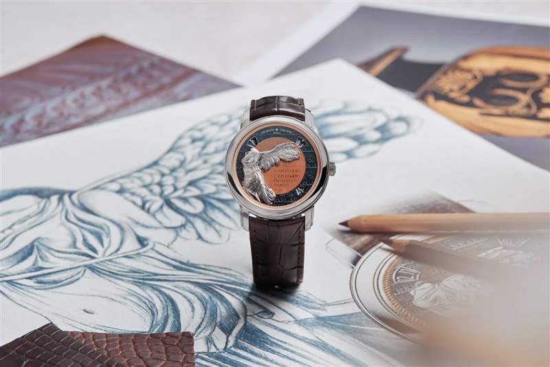 在腕表方面,雕像以白金雕刻的形式呈現,模仿了原始雕塑的藝術性。創造出在身體上流動的布料印象非常困難,需要完全掌握江詩丹頓的多種工匠技能。表盤底部同樣困難重重,采用多種類型的琺瑯,包括棕色 Champlevé 和藍色 Grisaille 琺瑯。這款腕表采用對比鮮明的色彩和材質,結合神話主題,使其成為我個人的最愛。