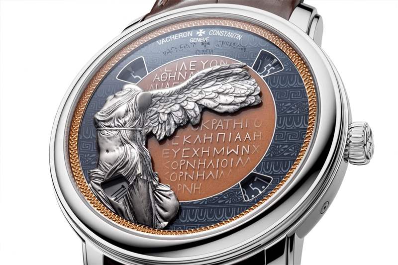 第三枚時計,江詩丹頓憑借來自薩莫色雷斯的勝利女神雕像,轉向了希臘歷史的希臘化時期。Victory,也被稱為耐克,是廣闊的希臘萬神殿中的一員,與標志性的奧林匹亞眾神并列。人們相信,Victoire de Samothrace 是為了紀念希臘在海上取得的一次重要勝利,因為女神被描繪成站在船頭上,而雕像是在北愛琴海薩莫色雷斯島上的一座寺廟建筑群中發現的。許多重要的海戰。