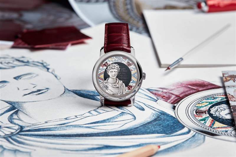 7620A/000G B929(奧古斯都的半身像) - 表殼/表盤: 42 毫米直徑 x 12.9 毫米厚度,18K 5N 玫瑰金表殼(Grand Sphinx de Tanis 和 Lion de Darius)或 18K 白金(Victoire de Samothrace 和 Buste d’Auguste),Champlevé 琺瑯飾帶,champlevé 琺瑯和琺瑯背景表盤(Grand Sphinx de Tanis),雕刻金屬和內鑲琺瑯飾帶,石材鑲嵌背景表盤(Lion de Darius),手工雕刻金飾帶,灰色琺瑯和琺瑯背景表盤(Victoire de Samothrace),手工雕刻金飾帶,琺??瑯和石頭微型馬賽克背景(Buste d’Auguste),透明藍寶石水晶底蓋,藍寶石水晶上金屬化鐫刻文字,手工鐫刻金色貼花與古銅色